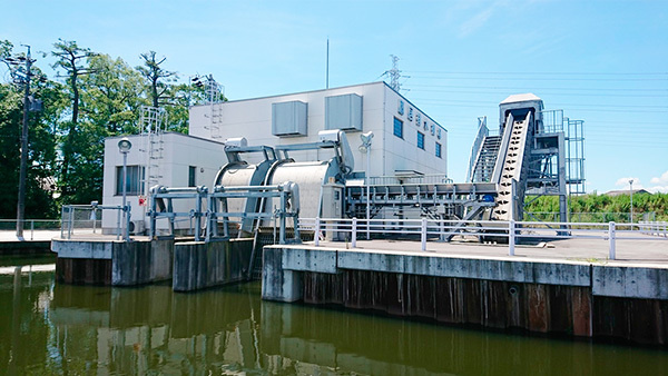 排水機場は排水路によって集められた雨水をポンプを使用して、強制的に河川や海へ放流する施設です。河川や海よりも排水路側の標高が低く、自然排水ができない場所に設けられます。